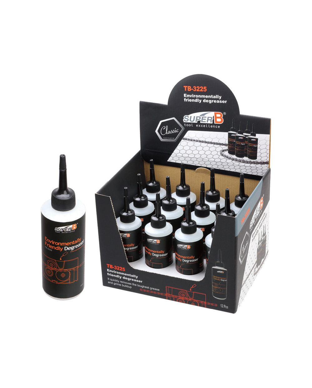 Zelo uporaben kot univerzalno tekoče čistilo za dele, idealno za čistilce verig Super B TB-3208 in TB -32800, razmaščevalec je zasnovan s posebno čistilno tekočino, namenjeno uporabi v čistilcu verig. Hitro odstranjuje nakopičeno maščobo in umazanijo, ne da bi pri tem poškodoval plastične ali gumijaste dele.