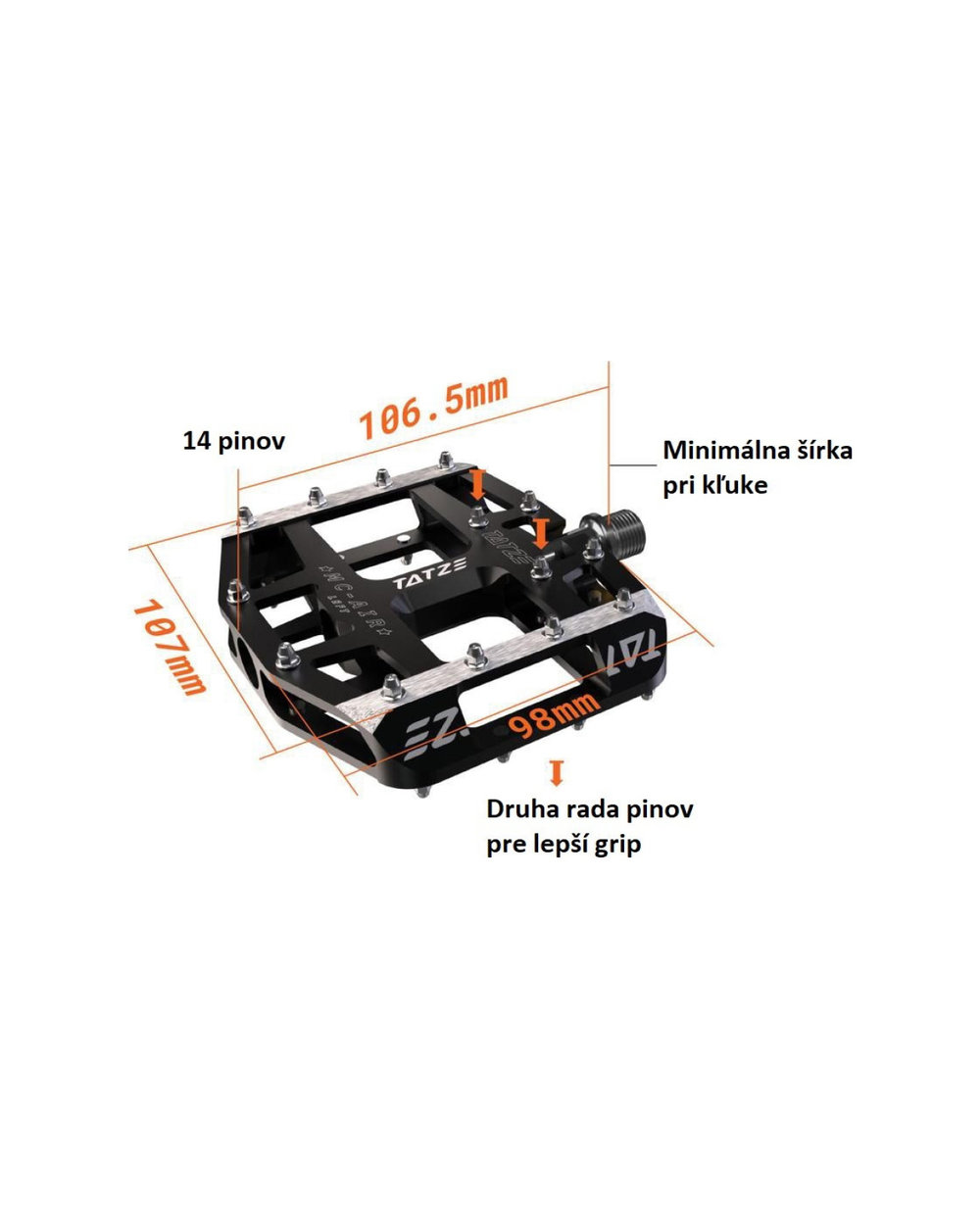Velika 107x98x16 mm (DxŠxV) velika platforma združuje varno površino z odličnim odmikom od tal in strani. Poševni sprednji del omogoča, da pedala drsijo čez ovire, in preprečuje nabiranje umazanije v pedalih.