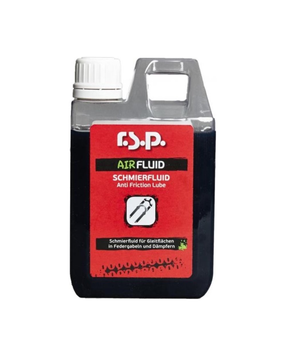 RSP Air Fluid je posebno mazivo za mazanje drsnih površin in drsnih ležajev vzmetnih vilic in amortizerjev. Uporablja se v zračnih komorah za mazanje zračnih tesnil, da se prepreči zatikanje amortizerja/vilice. Zmanjšuje trenje in ščiti tesnila pred obrabo. Zaradi dodanih aditivov je zračna tekočina izjemno obstojna brez potrebe po zamenjavi, ima protikorozijske lastnosti, na njeno viskoznost pa ne vpliva zunanja temperatura.