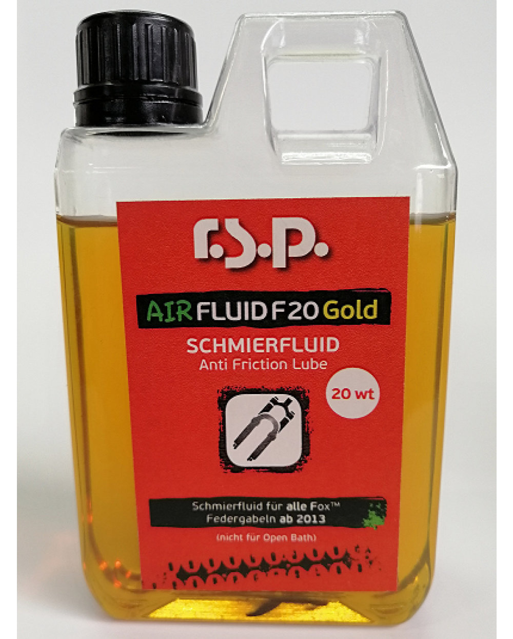 RSP LUBRICANT AIR FLUID F 20 GOLD 250ml Air Fluid je posebno mazivo za Foxove vilice in amortizerje od modelnega leta 2013 in za kartuše z oznakama FIT in O/C. Viskoznost 20WT Zmanjšuje trenje, ščiti tesnila pred obrabo in preprečuje penjenje maziva. Zaradi dodanih aditivov ima Air Fluid izjemno dolgo življenjsko dobo brez potrebe po zamenjavi, ima protikorozijske lastnosti, na njegovo viskoznost pa ne vpliva zunanja temperatura. Opomba: upoštevati je treba priporočila proizvajalca vzmetenja glede količine maziva in uporabe.