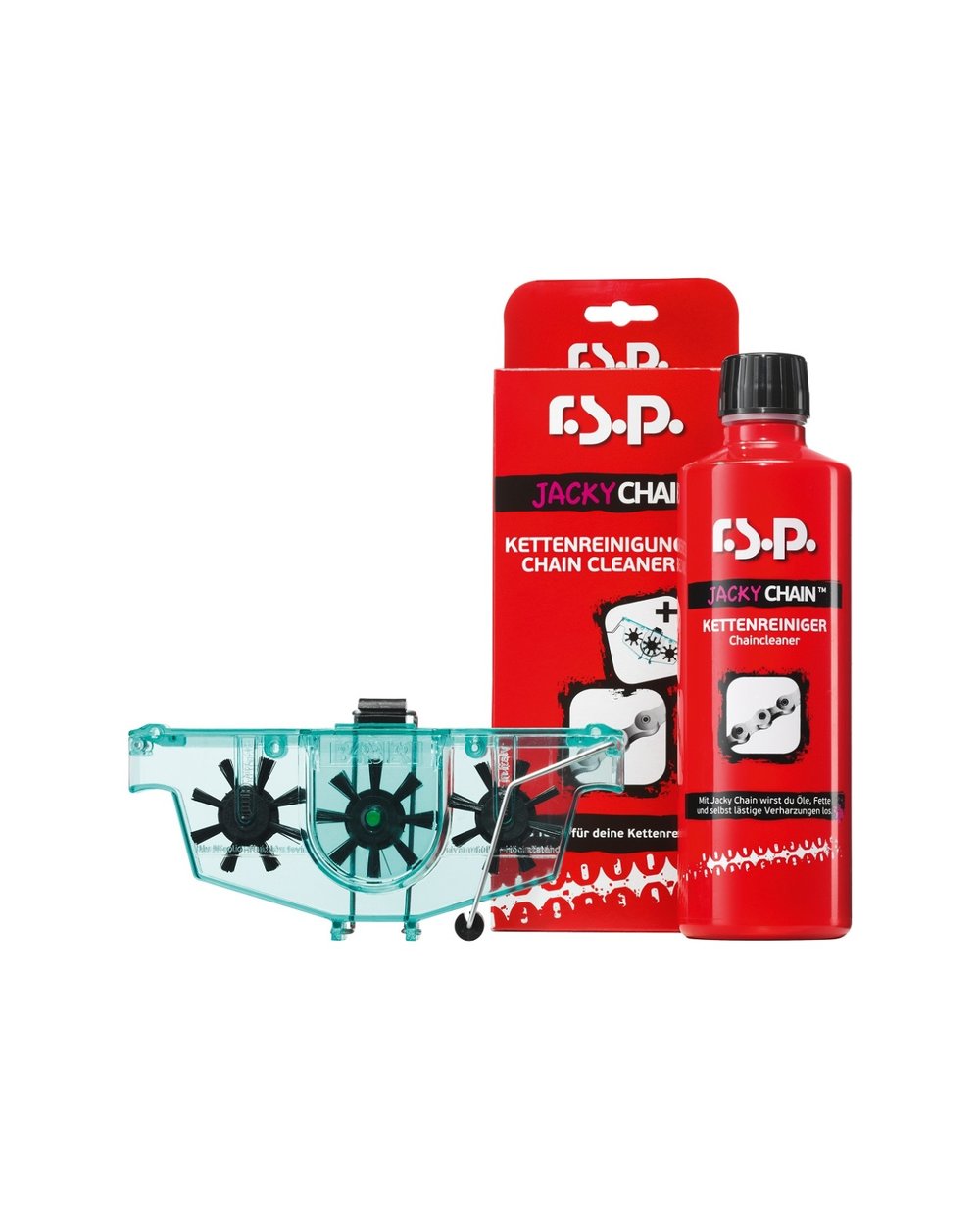 Komplet za čiščenje verige, vključno s pralnim strojem. Čistilo za verige. Odplakne olje, maščobo in umazanijo ter ustvari antikorozijski film. Ne vsebuje kislin, lugov, jedkih snovi, emulgatorjev ali vlažilnih sredstev. Pomivalno sredstvo za verige je vključeno v priročni embalaži. Pakiranje: 500 ml