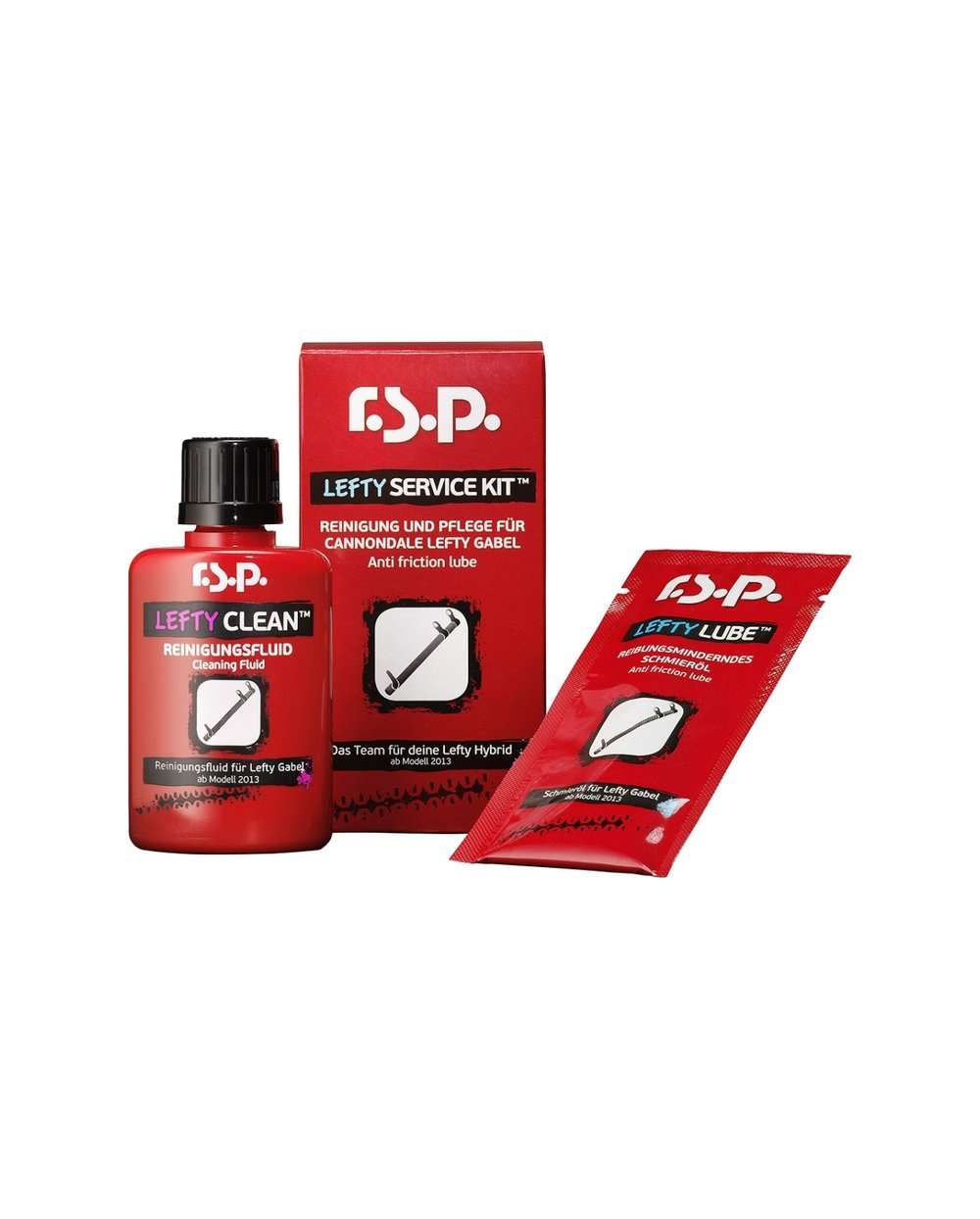 Cannondale Lefty komplet za vzdrževanje vilic od modelnega leta 2013 naprej. Vključuje Lefty Clean 10 ml za odstranjevanje originalne masti in natančen odmerek nove Lefty Lube 10 ml. Izdelano v sodelovanju s podjetjem Cannondale.