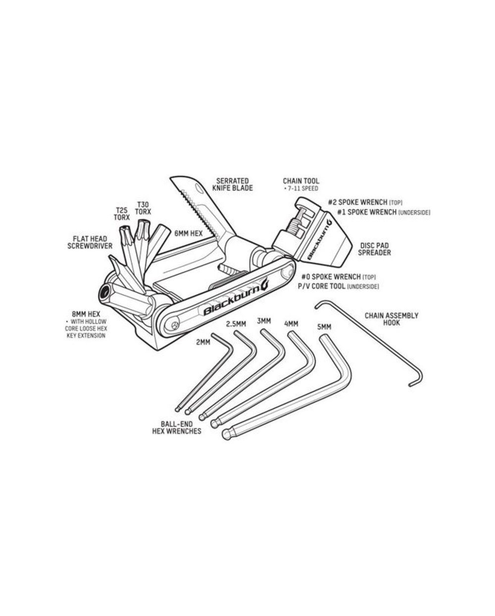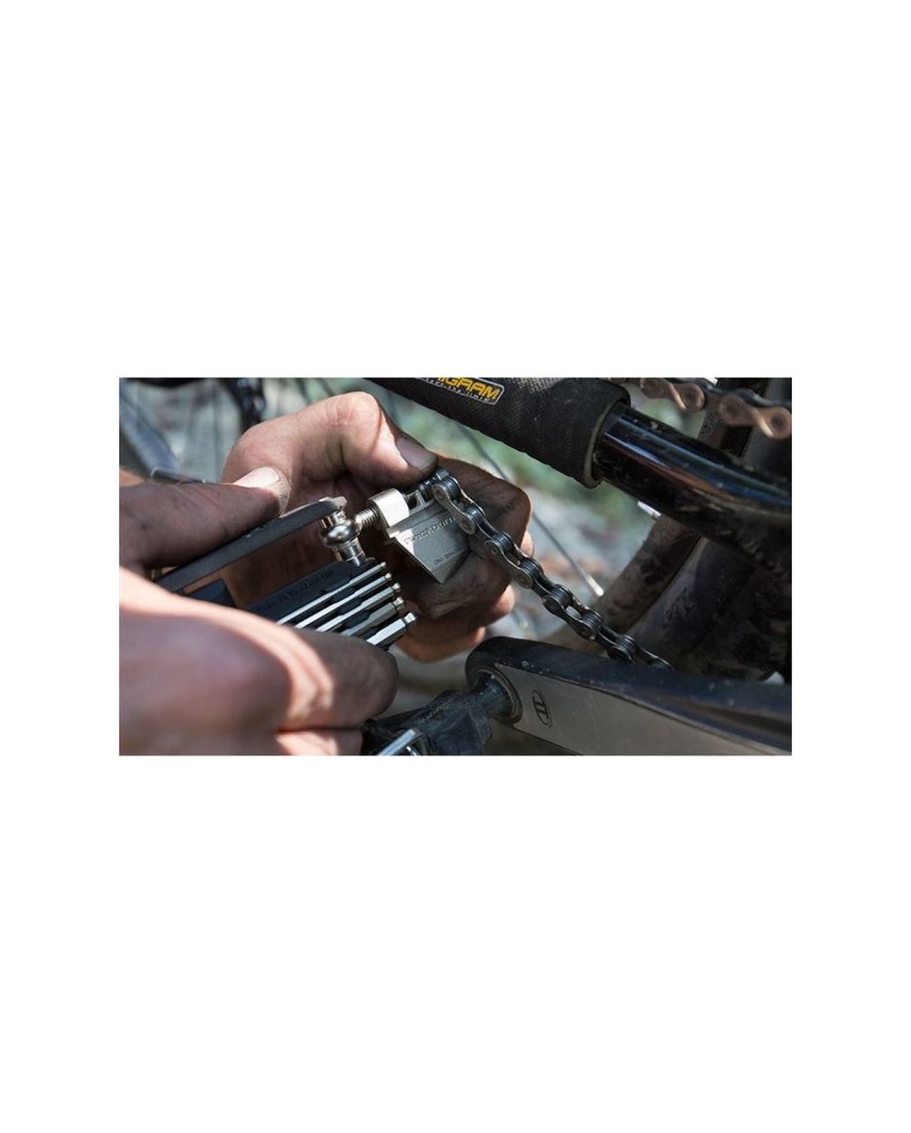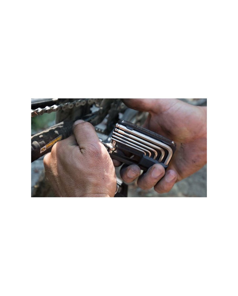 Kompakten komplet orodja z žago in ločenim inbusom za lažje rokovanje. VKLJUČUJE 2; 2,5; 3; 4; 5; 6; 8 mm inbus - izvijač - torx 25 in 30 - žaga - zakovica - centrirni ključi 0, 1 in 2 - nosilec verige - ločilnik zavornih oblog