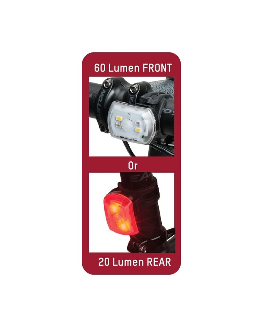 Pametna luč Blackburn, ki lahko služi kot sprednja (bela) ali zadnja (rdeča) - samo preklopite! Na voljo tudi v priročnem kompletu 2 luči! 60 lumnov (spredaj), 20 lumnov (zadaj). Vidljivost 180°. 1,5 ure osvetlitve, 5 ur utripanja. LED indikator napolnjenosti, univerzalna namestitev brez orodja, vodotesnost po standardu IP-65.