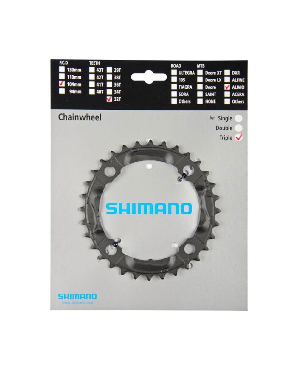 Tip: MTB, skupna teža paketa: 121 g, število zob na menjalniku: 32, menjalniki: 9 hitrosti, za kombinacije menjalnikov: 44/32/22, število prestav: 3x9, razmik menjalnikov: 104 mm, črna
