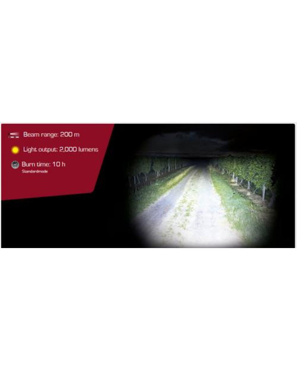 Trajanje svetlobe - 2,5 h (način visoke moči), 5 h (način moči), 10 h (standardni način), 20 h (način eko), 9 h (utripanje), 11 h (impulzno), 10 h (utripanje SOS)