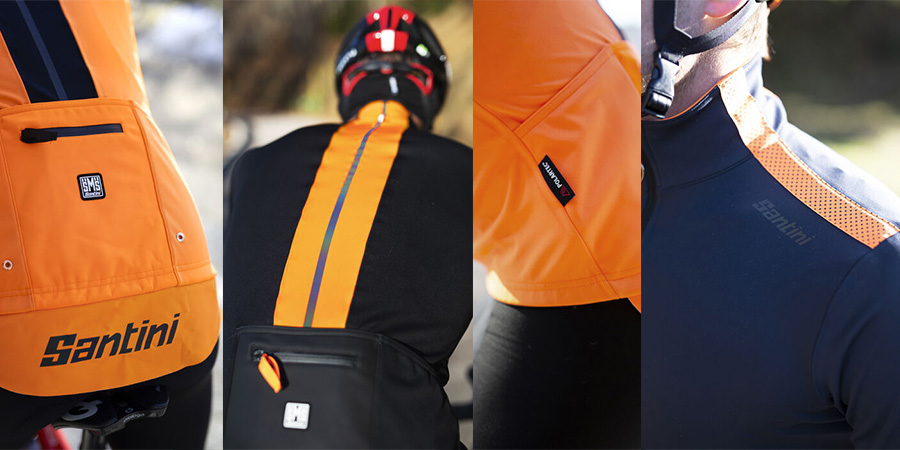 - Veliki odsevni elementi na ramenih in hrbtu ter velik odsevni logotip Santini na hrbtu vam zagotavljajo dobro vidljivost