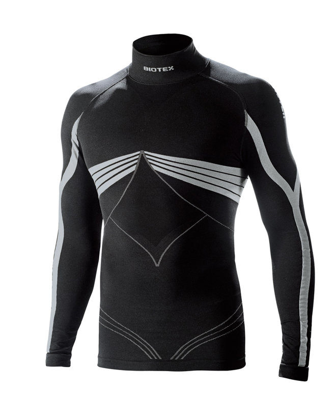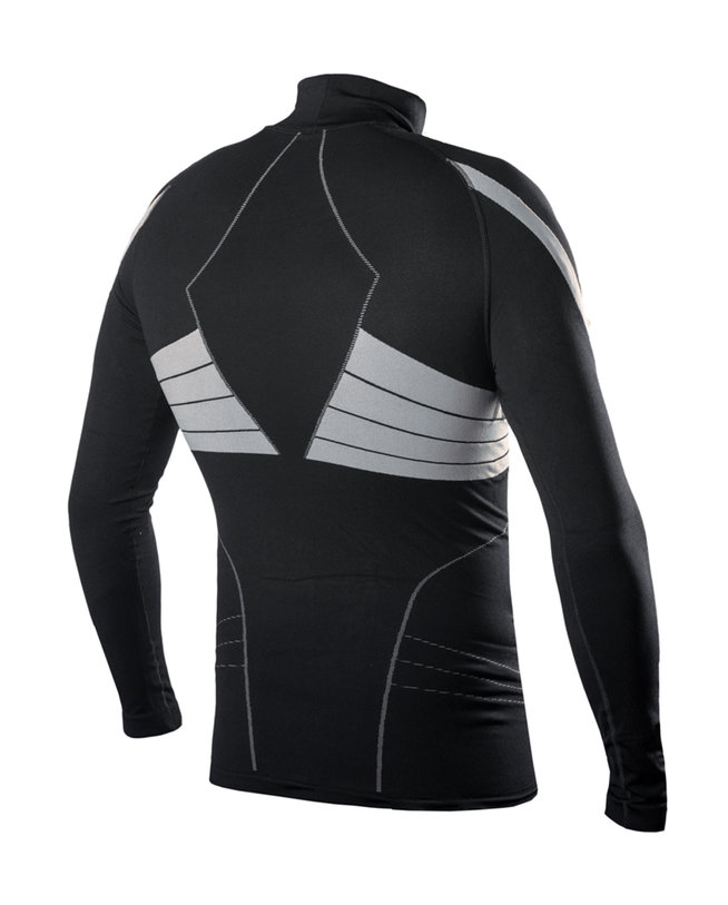 Elastična majica z ovratnikom z visoko kompresijo, brez šivov. Znojenje in toplota sta glavni značilnosti tega oblačila, ki ga zagotavlja posebej izdelana tkanina iz polipropilena. Proučili smo različne načine tkanj, da bi zagotovili popolno udobje ter prepustnost vlage v delih z najmočnejšim potenjem, zahvaljujoč rebrastim področjem, ki zagotavljajo boljše prileganje telesu. Kljub večji kompresiji, ki poudari mišičje, je to oblačilo zelo mehko in prijetno na koži. Idealno za vse zimske športe.