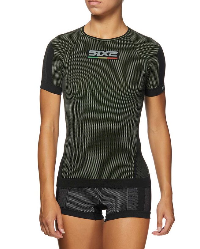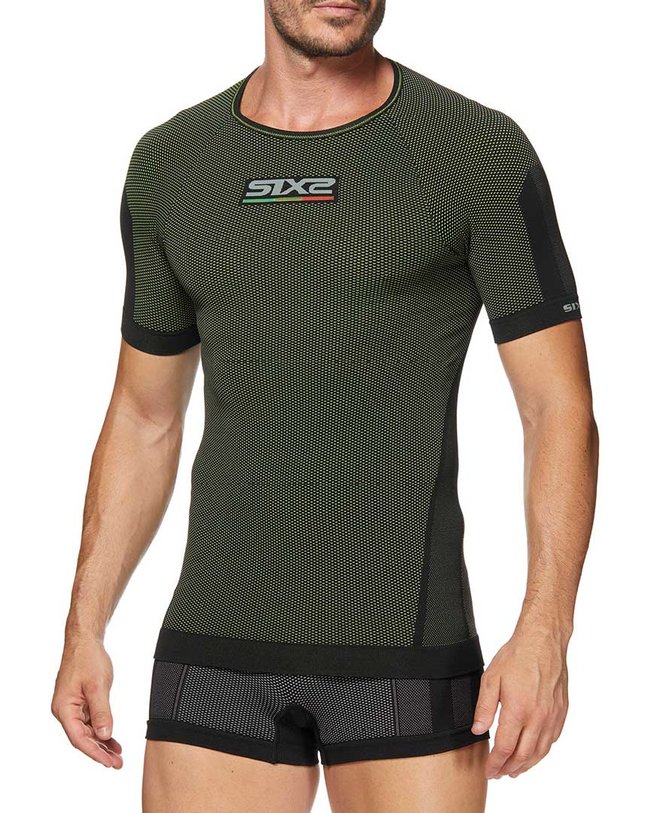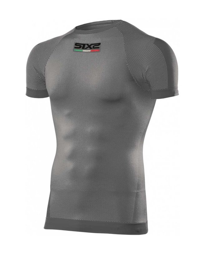 SIXS Carbon spodnje perilo majica s kratkimi rokavi s kratkimi rokavi, multi-športni izdelek, idealen v vseh pogojih. Za razliko od modela brez rokavov, rokav objame zgornji del roke, ki je podvržen obilnemu znojenju in ohranja kožo suho. Najlažje in najbolj zračno polipropilensko vlakno na trgu v kombinaciji z resnično karbonsko prejo, ki zagotavlja prenos toplote in antistatične lastnosti, ki ščitijo telo pred električnim nabojem, ki ga povzroča drgnjenje več sintetičnih tkanin (stanje, značilno za športna oblačila).