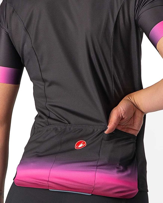 Prosecco mikro mrežica na torzijskem dresu vas ohranja na suhem. Stranske mrežaste plošče za dodatno zračnost. Elastični rokavi Velocity Rev2 z ravnim koncem. 3 zadnji podaljšani žepi z odsevno obrobo.