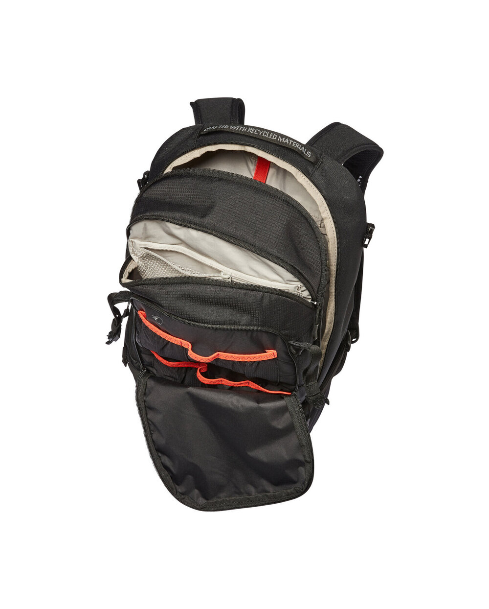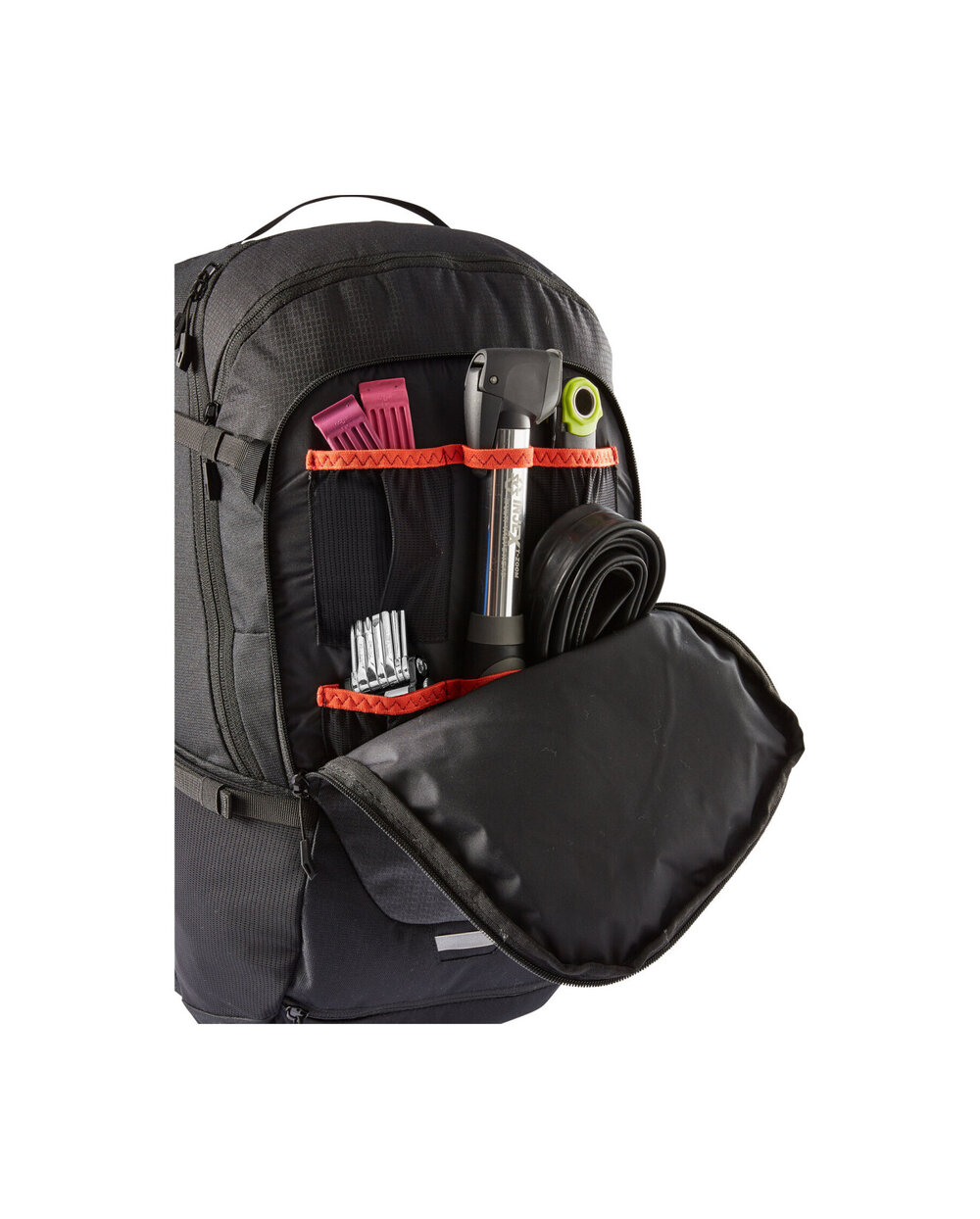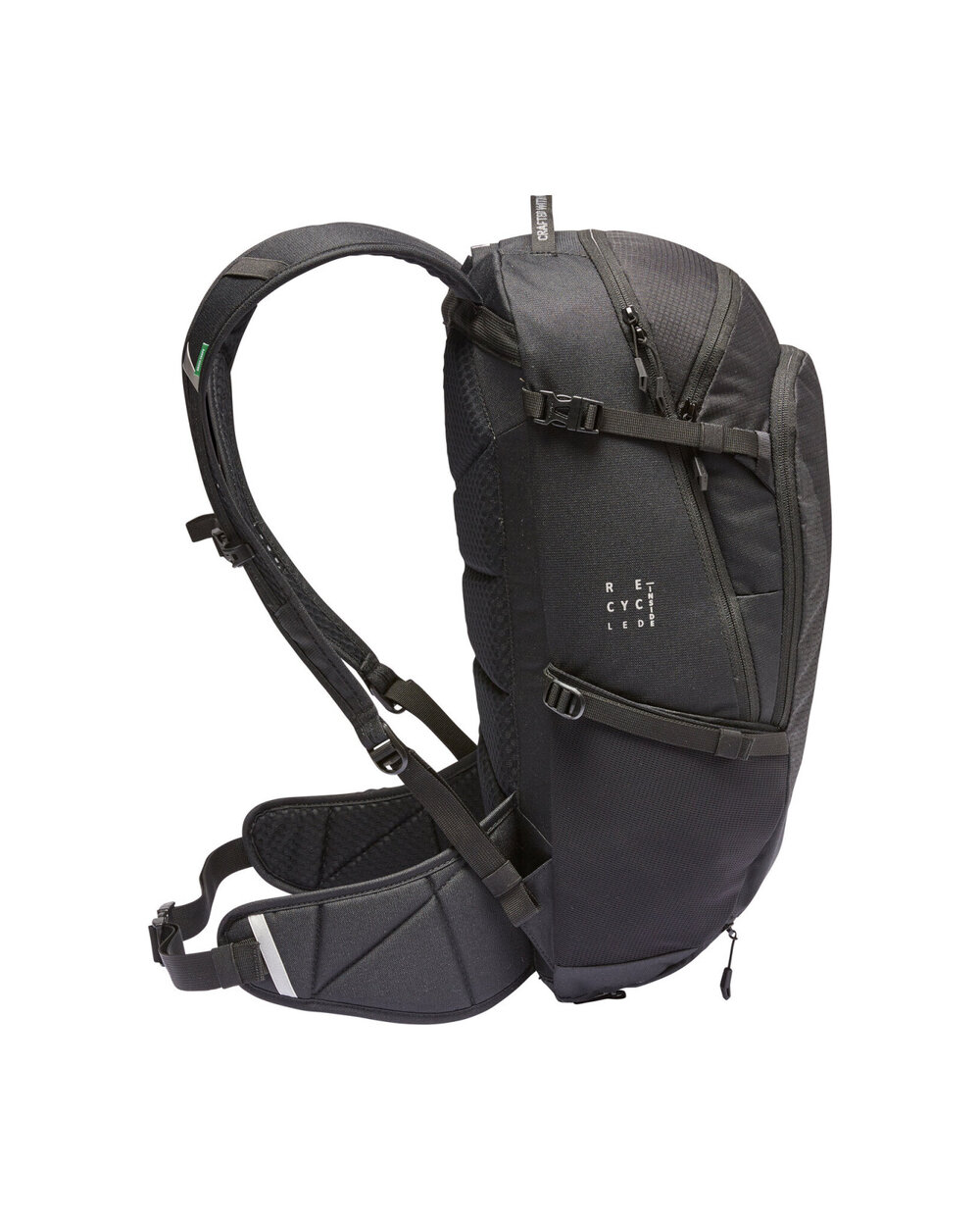- ergoshape - ergonomski in dihajoči ramenski trakovi - Vzmetno kolo - Vzmetenje zagotavlja stabilnost in udobje, zagotavlja popolno prilagoditev in dobro prezračevanje z debelejšim oblazinjenjem v ledvenem območju, da sprosti tlačne točke - Udoben ledveni pas potegne težišče nahrbtnika proti hrbtu in skupaj z ramenskimi trakovi Ergoshape zagotavlja popolno pritrditev z optimalno svobodo gibanja koles - Pred glavnim prostorom je notranji žep z zadrgo, predal orodja, držalo za čelado, desno krilo ledvenega pasu, žepi za raztegnje - Eko zaključek zaščiti nahrbtnik pred vodo in madežem