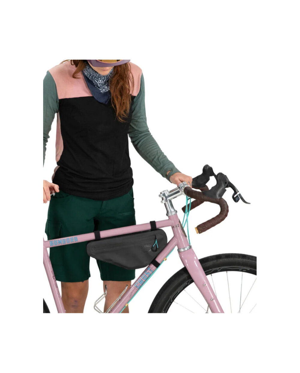 Kolesarska torba v obliki klina z integriranim okvirjem za stabilno in varno shranjevanje stvari v trikotnem prostoru okvirja kolesa.
