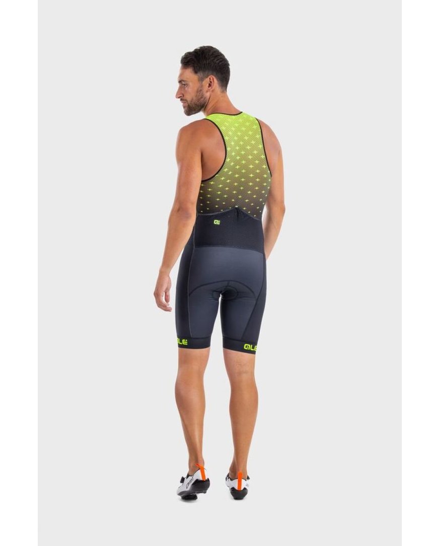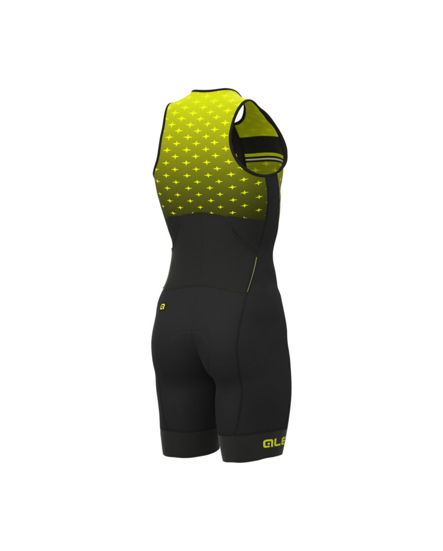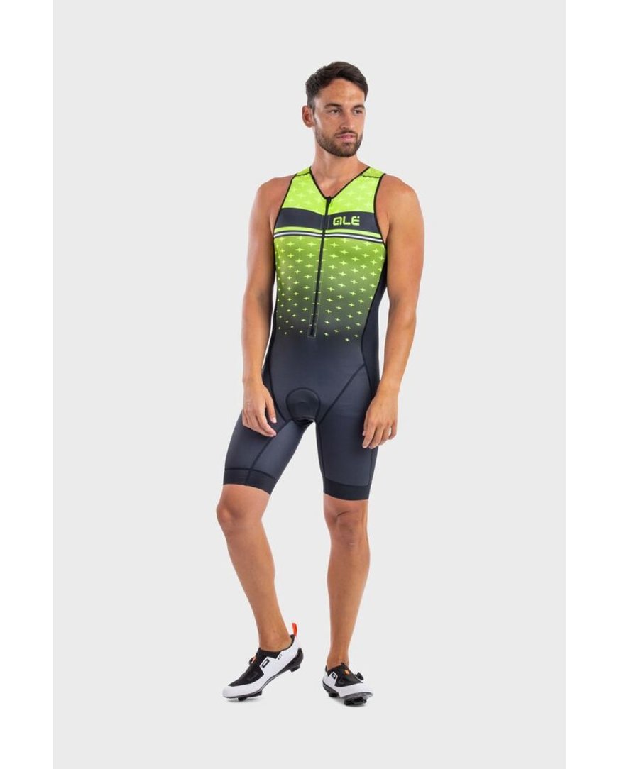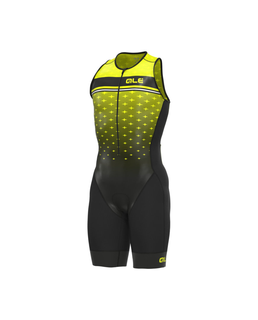 Triatlonska obleka, zasnovana neposredno za triatlonce Triatlonska obleka brez rokavov Alé TRIATHLON STARS LONG TRI je zasnovana neposredno s strani športnikov za njihove posebne potrebe med dolgimi tekmami. Kombinezon zagotavlja res odlično zračenje zaradi možnosti popolnega odpiranja sprednjega dela, ki je delno všit kot ločen kos. Zadnji del je nato izdelan iz mrežaste tkanine Mesh Dragon, ki zelo dobro diha. V zadnjih žepih lahko nato shranite energijske ploščice za kolesarski in tekaški del dirke.