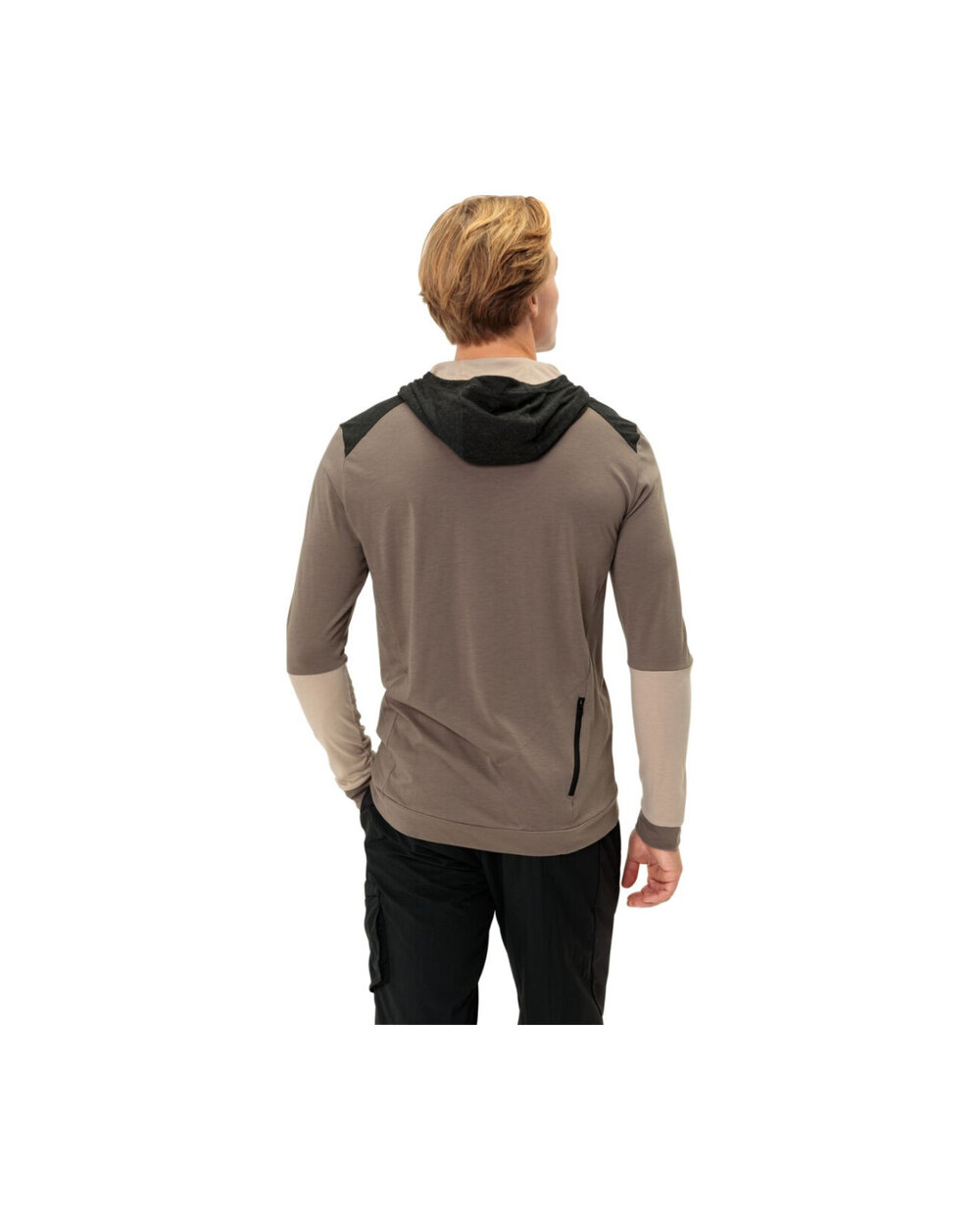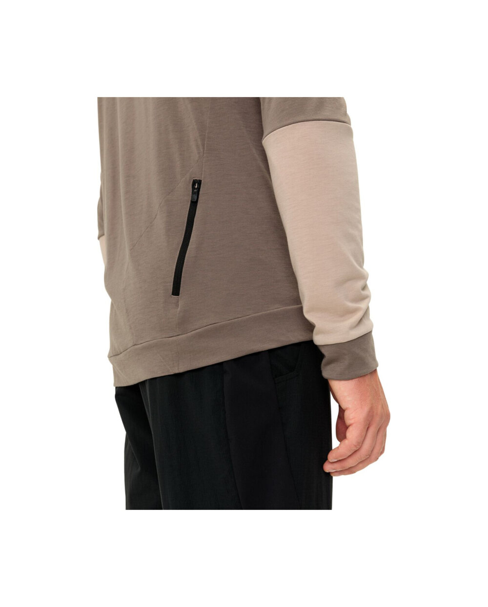 - majhen zadnji žep z zadrgo, kapuco, kontrastni ravni šivi, barvni blok