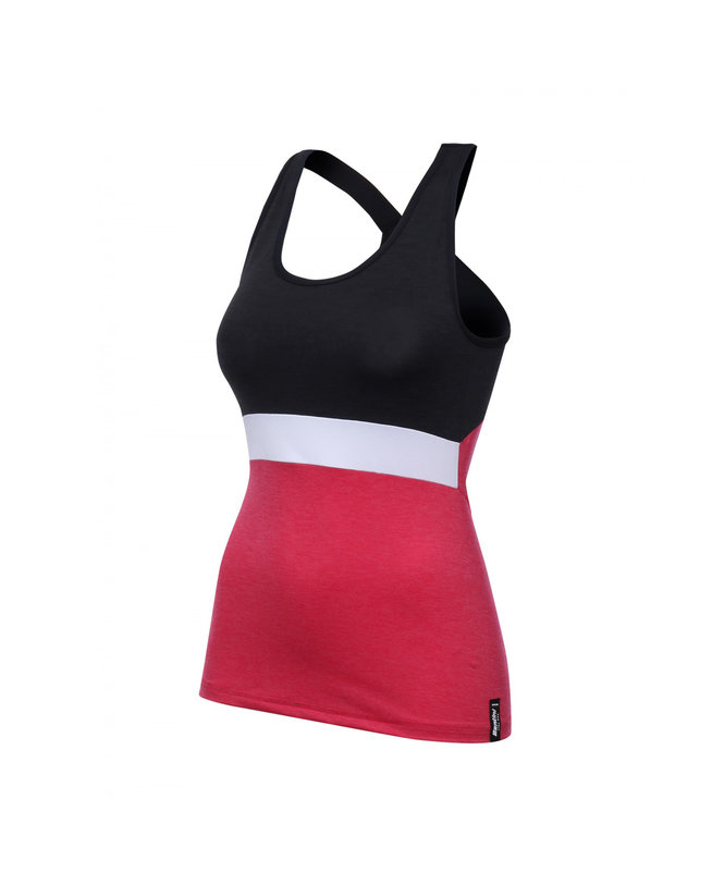 Ženska majica iz Andore lahka in elastična tkanina. Prilagojeno za obrise ženskega telesa za tesno udobno prileganje. Visoko zračen. Trdni elastični oporniki, ki so prečkani na hrbtni strani, zagotavljajo, da singlet ostane na mestu tudi med naporom visoke intenzivnosti. Komplet z osrednjim zadnjim žepom. Idealno za notranje ali vroče poletne vožnje.