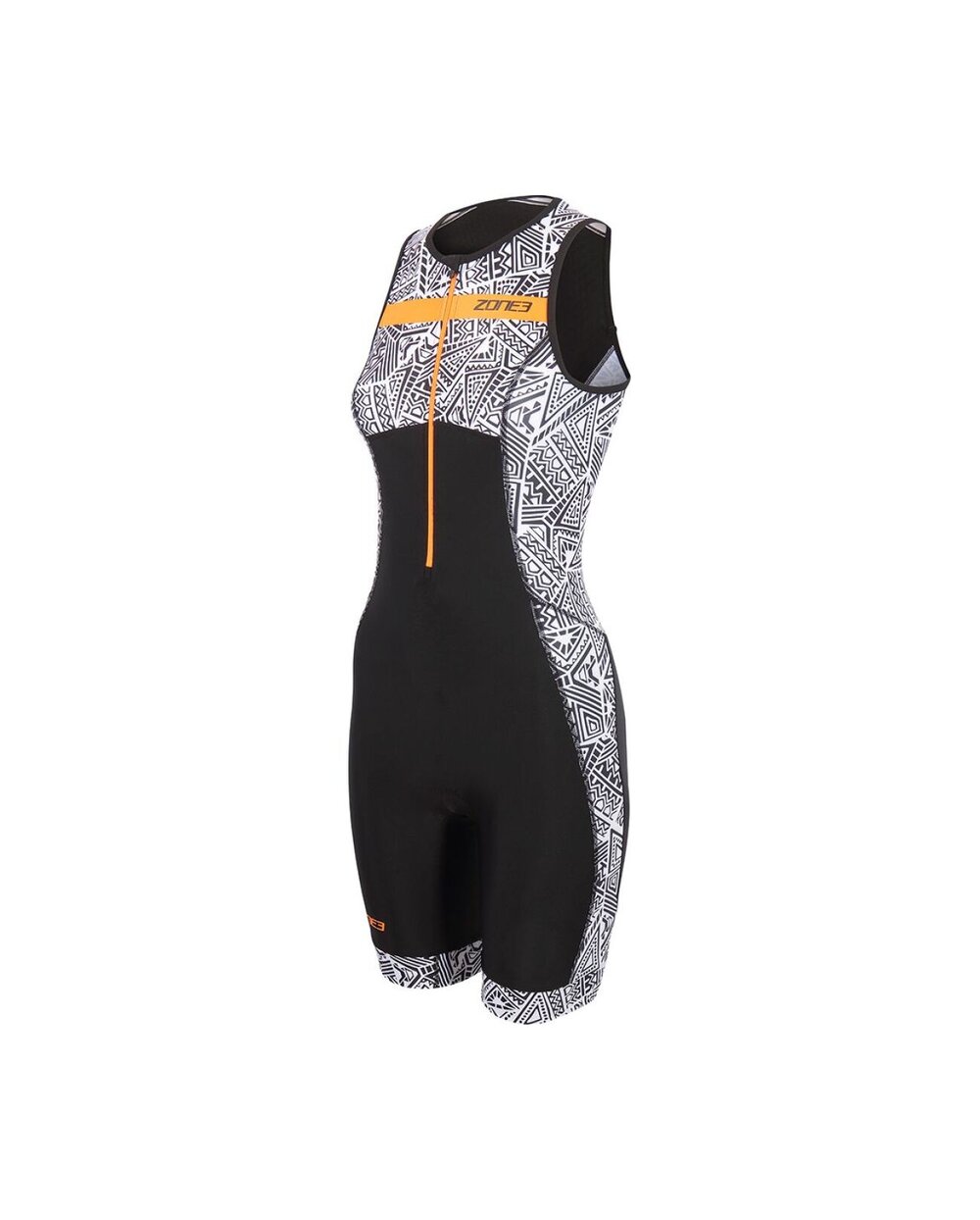 Ženski triatlonec brez rokavov Zone3 Activate+ Kona Speed v sodobnem črno-belem dizajnu z oranžnimi detajli je vsestranski in zmogljivostno prilagojen kombinezon, zasnovan za triatlonce, ki želijo največjo svobodo gibanja in zračnost med vsako disciplino. Ta model združuje eleganten športni videz z vrhunsko funkcionalnostjo materialov, ki učinkovito odvajajo znoj in se hitro sušijo, kar boste cenili predvsem na zahtevnih treningih in dirkah v toplejšem vremenu.