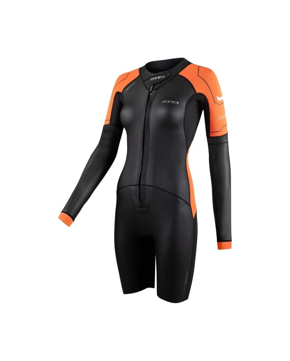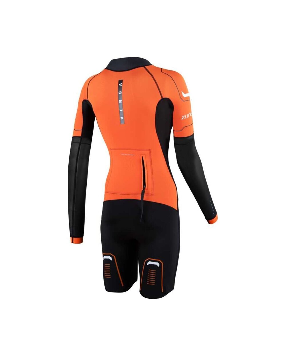 Zone3 Women's Versa Swimrun je vsestranska ženska neoprenska obleka, zasnovana posebej za disciplino swimrun, kjer se plavanje in tek gladko izmenjujeta. Obleka nudi idealno ravnovesje med prožnostjo, toplotnim udobjem in vzdržljivostjo, zaradi česar je primerna tako za začetnike kot za napredne športnike. Kombinacija naravnega kavčuka Yulex® in neoprena Speedflo zagotavlja dobro fleksibilnost, bolj ekološki pristop pri izdelavi ter hkrati zmanjšan vodoodpor za učinkovitejše plavanje. Sprednja zadrga omogoča hitro oblačenje in enostavno regulacijo temperature med tekom ali prehodi, kar je pri swimrunu ključnega pomena. Krajši kroj rokavov skupaj z možnostjo dopolnitve z odstranljivimi vložki omogoča prilagajanje obleke trenutnim razmeram. Praktičen element so integrirani žepi, ki zagotavljajo dovolj prostora za shranjevanje energijskih gelov ali manjše obvezne opreme. Krepki oranžni detajli povečujejo vidljivost v odprtih vodah in prispevajo k varnosti.