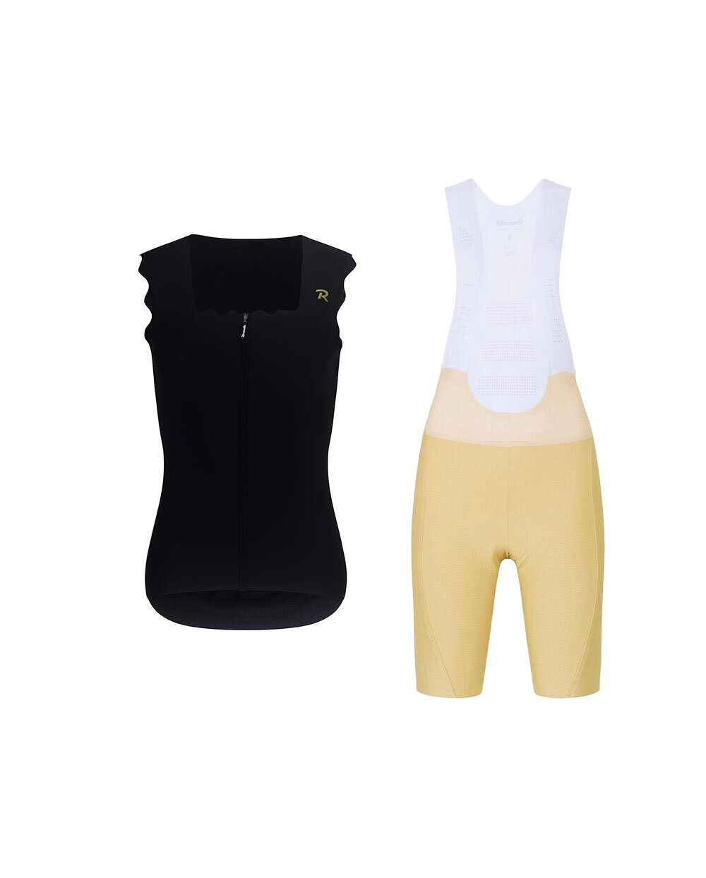 Stična in funkcionalna kolesarska oprema Rivanelle združuje elegantno brezrokavno majico SCALLESSA v črni barvi in vrhunske kratke hlače z naramnicami NOVEL PRO v bež barvi. Ta kombinacija je idealna za kolesarke, ki želijo na kolesu izgledati izjemno in si hkrati privoščiti maksimalno udobje tudi pri daljših vožnjah.